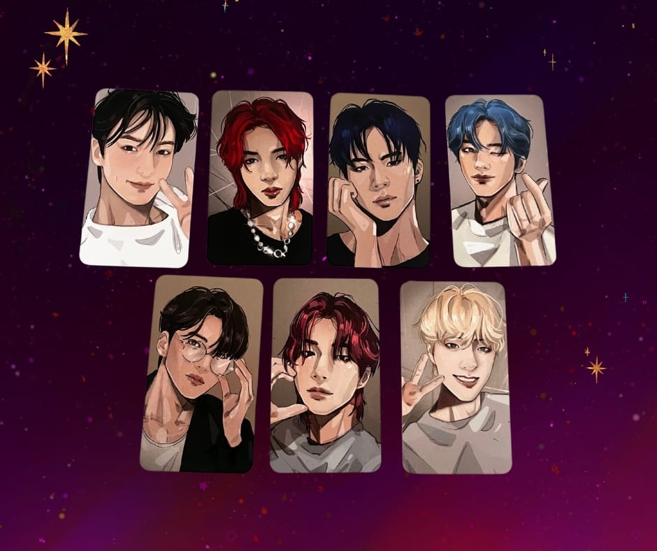 Full photocard set for fictional K-pop group KOSMIC (코스믹). This set contains all seven members, as shown in the photos: Changmin, Byunho, Tai, Hajun, Simon, Haru, and Jaesung.