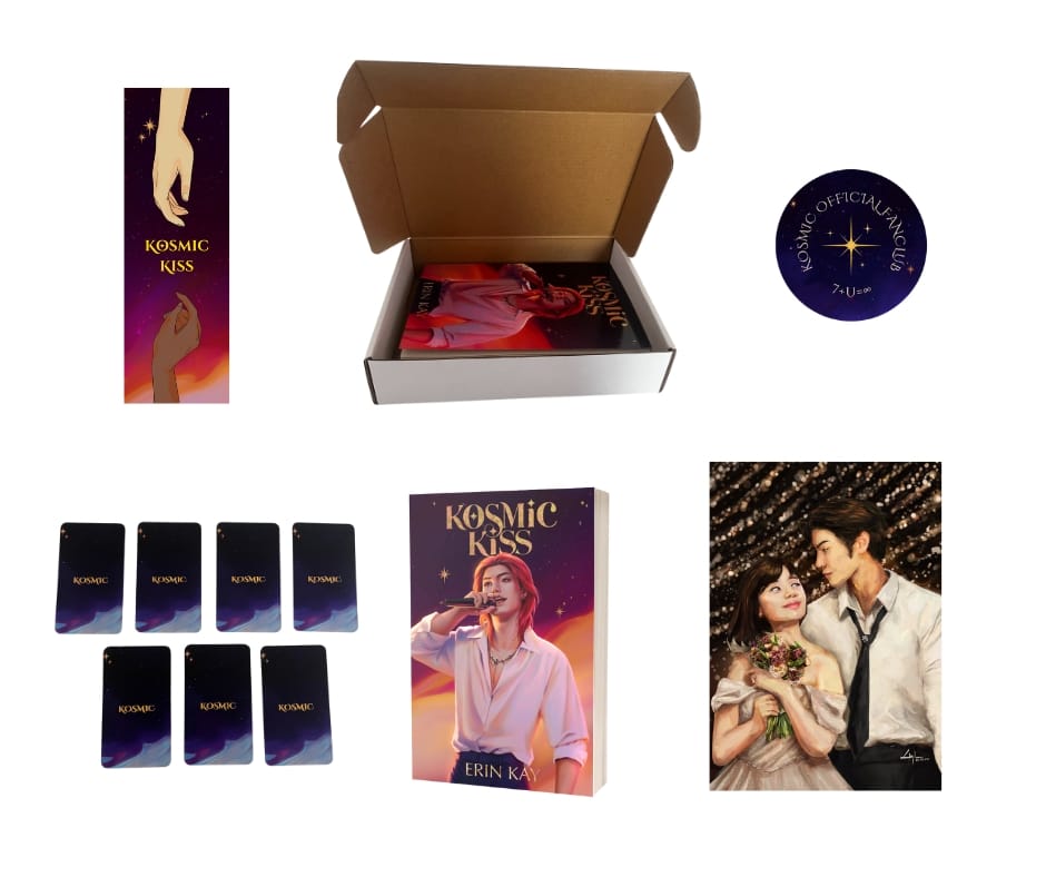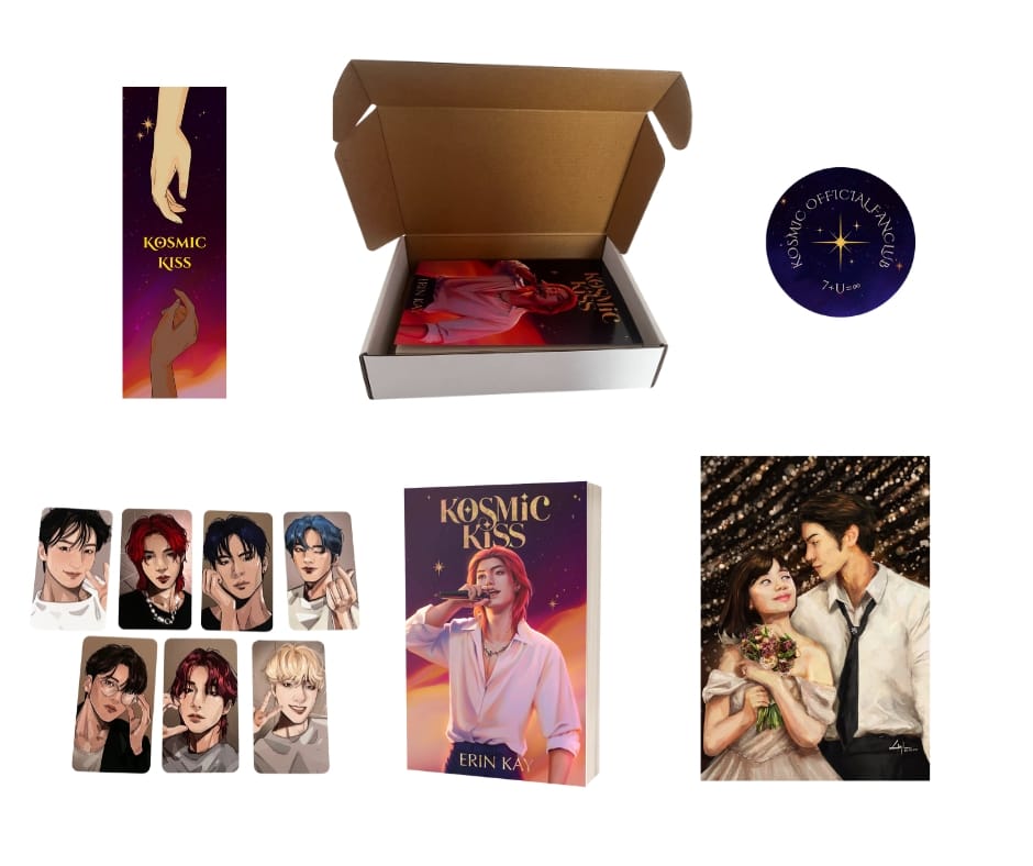 This book box, inspired by K-pop albums, contains a signed copy of KOSMIC Book Two Kosmic Kiss, two random character photocards, a Kosmic Kiss bookmark, one fanclub sticker, an Aera & Hajun Kosmic Heart Epilogue art print, and a "CD" inclusion with a QR code to a Spotify playlist.